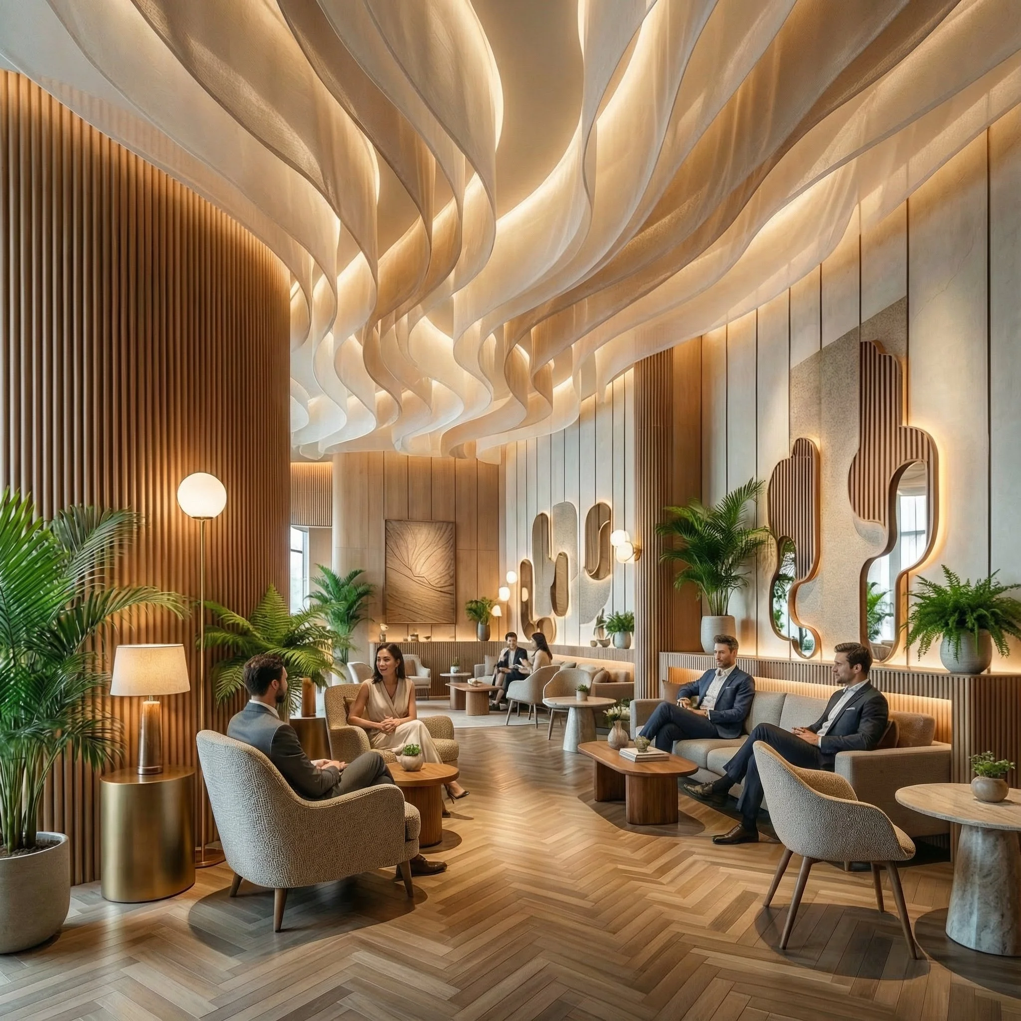 Wavy wood surfaces extend organically from custom furniture into wall planes and ceilings, visually connecting different zones and reinforcing a cohesive architectural language. This continuous gesture creates rhythm and softness, counterbalancing the precision of the contemporary interior.